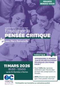 Aussi, le service Pédagogie Education est heureux de vous convier à la conférence « Apprendre à penser juste en découvrant pourquoi on pense faux ! » mercredi 11 mars prochain de 8h30 à 12h au lycée St Stanislas à Nantes.