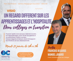 Le service Pédagogie-Education propose mardi 27 janvier prochain à 18h, un webinaire sur le thème « Un regard différent sur les apprentissages et l’hospitalité ».